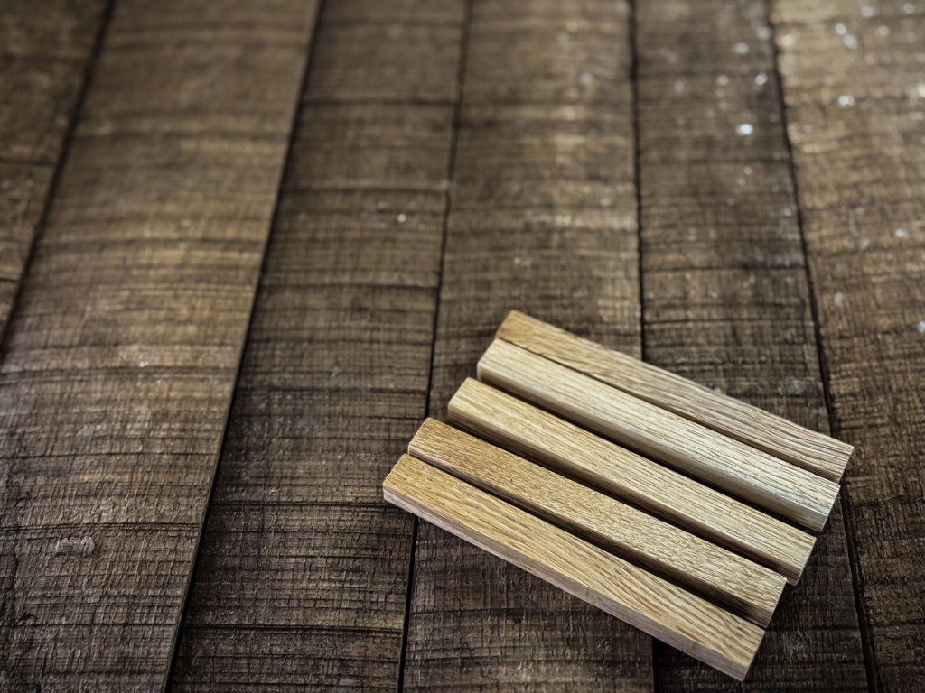 何十年も国内老舗蒸留所でウイスキーを育ててきた樽材。その歴史ある樽を、手のひらサイズのスティックに生まれ変わらせたのが樽スティックです。